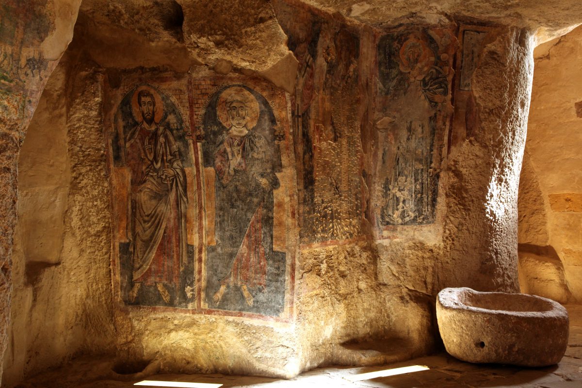 Der Eingang zur Kirche San Giovanni in Monterrone ist durch ein einfaches und strenges Portal gekennzeichnet, typisch für Felsenkirchen. Beim Betreten wird man von einer beeindruckenden Umgebung empfangen, mit einem einzigen Kirchenschiff und einer Reihe von Nischen und Altären, die direkt in den Felsen gehauen sind. Die Wände sind mit Fresken aus dem Mittelalter verziert, von denen viele leider durch die Zeit und Feuchtigkeit beschädigt wurden, aber immer noch die tiefe Hingabe vermitteln, die das Leben dieses heiligen Ortes geprägt hat.Die Fresken, die zwischen dem 13. und 14. Jahrhundert entstanden sind, zeigen Szenen aus dem Leben Christi, der Jungfrau Maria und verschiedenen Heiligen, darunter Johannes der Täufer, dem die Kirche gewidmet ist. Diese Fresken wurden von lokalen Künstlern geschaffen und sind ein wichtiges Beispiel für mittelalterliche Malerei in Basilikata, mit deutlichen byzantinischen Einflüssen in den langgestreckten Figuren und lebendigen Farben. Trotz der Beschädigungen bewahren einige der Bilder immer noch eine erstaunliche Lebendigkeit, die den Besuchern einen Eindruck von der ursprünglichen Schönheit des Gemäldes vermittelt.Ein besonders interessantes Element ist der Hauptaltar, der in den Felsen gehauen und mit einem großen Fresko des Pantokrators Christus verziert ist, umgeben von den Symbolen der vier Evangelisten. Dieses Fresko, von außergewöhnlicher Ausdruckskraft, ist ein Meisterwerk der Felsenkunst und bildet den Mittelpunkt des liturgischen Raums. Ein interessantes Ereignis in Bezug auf die Kirche ist ihre Wiederentdeckung im 20. Jahrhundert, als eine Reihe von Restaurierungs- und Ausgrabungsarbeiten zahlreiche Fresken und architektonische Strukturen ans Licht brachten, die jahrhundertelang verschüttet und vergessen waren. Dieses Ereignis ermöglichte die Wiederherstellung eines wichtigen Teils des künstlerischen und historischen Erbes von Matera und lieferte neue Informationen über das religiöse und kulturelle Leben der Stadt im Mittelalter.