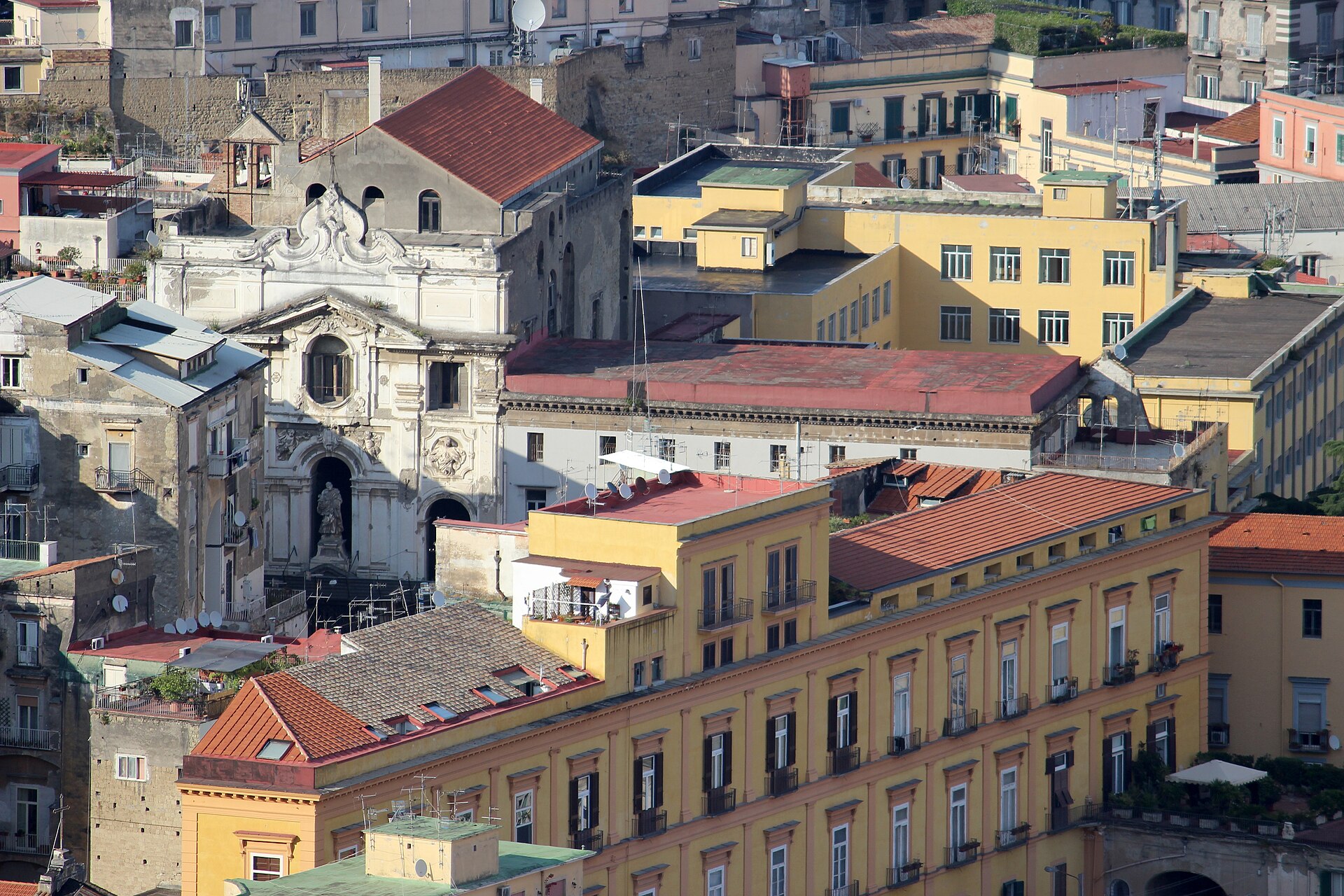 The facade of the church, designed by Cosimo Fanzago, is a masterpiece of Baroque architecture, with a combination of classical elements and elaborate decorations. The facade is divided into three orders, with a central portal surmounted by a triangular pediment and two side niches housing statues of saints. Above the portal, a semicircular window illuminates the interior of the church, creating a play of light and shadow that enhances the beauty of the architecture.